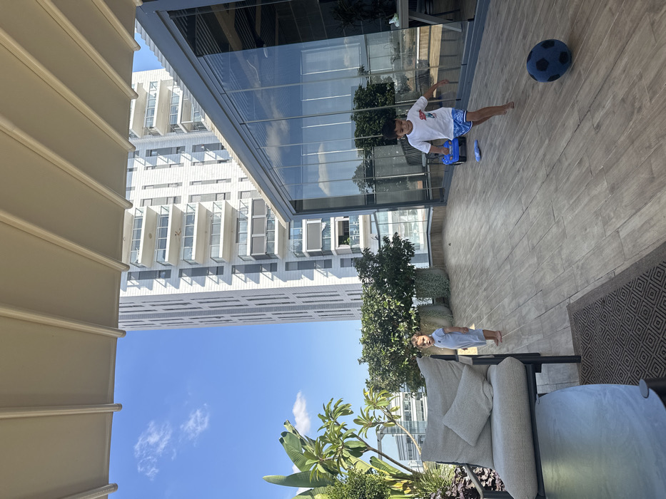 The image captures a modern outdoor rooftop or large balcony area in a residential setting within Rishon LeZion, Israel, under a bright blue sky with sparse white clouds. The foreground features a light-colored, wood-textured tiled floor and a beige retractable pergola structure overhead. On the left, a single-seater outdoor armchair with light cushions rests on a dark patterned rug, with a dark, circular table partially visible in the extreme bottom left. Adjacent to this, large potted plants with broad green leaves are present. In the mid-ground, a young child, approximately 1-3 years old, wearing a light-colored one-piece romper, stands barefoot and stationary, facing forward. Behind this child, several potted green trees line a low wall. To the right, an older child, approximately 5-7 years old, with dark hair, wearing a white t-shirt and blue patterned shorts, is barefoot and depicted in motion, running towards the right side of the frame. A dark blue or black soft soccer ball is positioned on the floor in front of this child, and a small blue ride-on toy is visible behind him. The background reveals a tall, modern high-rise apartment building with a light-colored facade, numerous balconies featuring glass railings, and some windows equipped with dark roller blinds. To the right of the potted trees, a modern glass-enclosed structure, possibly a sunroom or building extension, reflects the sky and surrounding environment. Shadows indicate strong overhead sunlight.