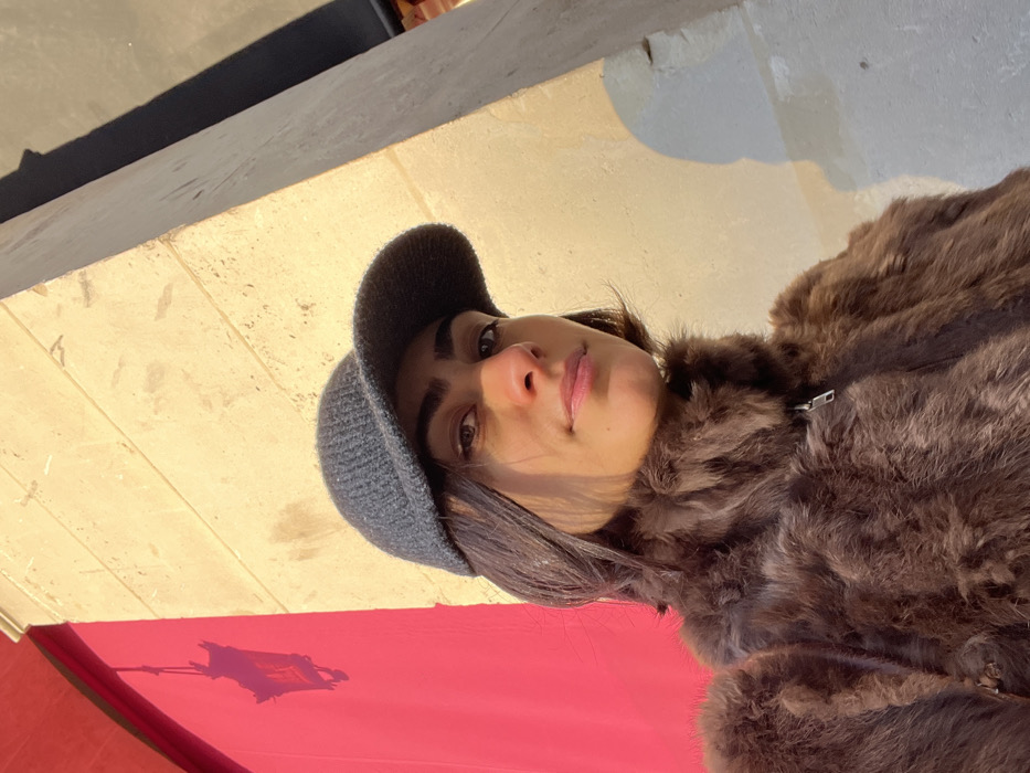 A young adult female is depicted in a close-up, angled portrait under direct sunlight. She has medium-toned skin, dark brown hair partially covered by a dark grey knitted baseball cap, dark eyebrows, and brown eyes. Her lips are closed in a slight smile. She wears a brown, shaggy, fur-like coat with a high collar, revealing a silver zipper pull at her neck. Strong, warm light illuminates her from the right, casting shadows on the background elements. To the left of the subject is a vibrant magenta-red wall or door, bearing the distinct shadow of an ornate, hanging lantern. To the right, a textured light beige stone wall or column is visible, exhibiting block patterns and deep shadows that indicate the sun's angle. The scene is set in the city of Paris, France.