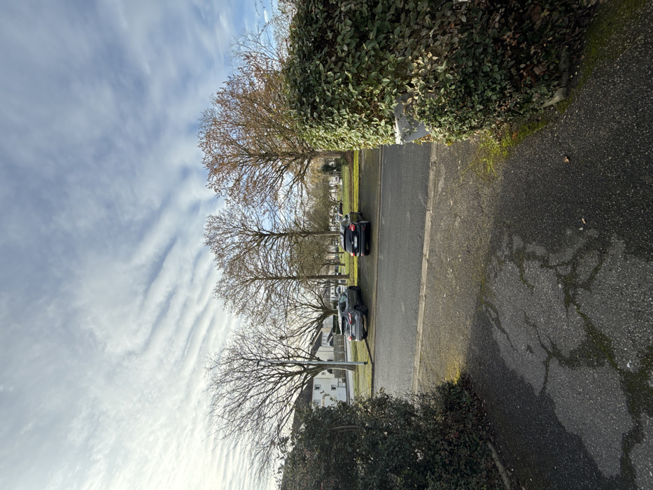 The image presents a static, eye-level view of a residential or suburban street scene within the city of Caen, France, on a clear day with significant cloud cover. The foreground consists of a cracked asphalt driveway or path, flanked by dense evergreen hedges on the left and right. A paved road runs horizontally across the mid-ground. Beyond the road, a paved parking area is visible, where two vehicles are parked facing away from the camera. On the left, a dark grey Nissan Qashqai SUV is positioned. To its right and slightly behind it, a black Audi A3 sedan is parked. A thin, white vertical pole stands behind the grey SUV. Further beyond the parking area lies a grassy median or park, populated by several deciduous trees, most of which are bare-branched, indicating a late autumn or winter setting. Some trees retain light brown or yellowish foliage. In the far background on the left, white residential buildings are partially visible through the trees. The sky above is bright blue with extensive, wispy white cirrus clouds. Direct sunlight is evident, casting distinct shadows across the scene. No individuals or active interactions are visible.