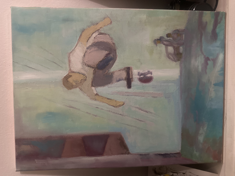 A painting shows a figure mid-air, seemingly skateboarding