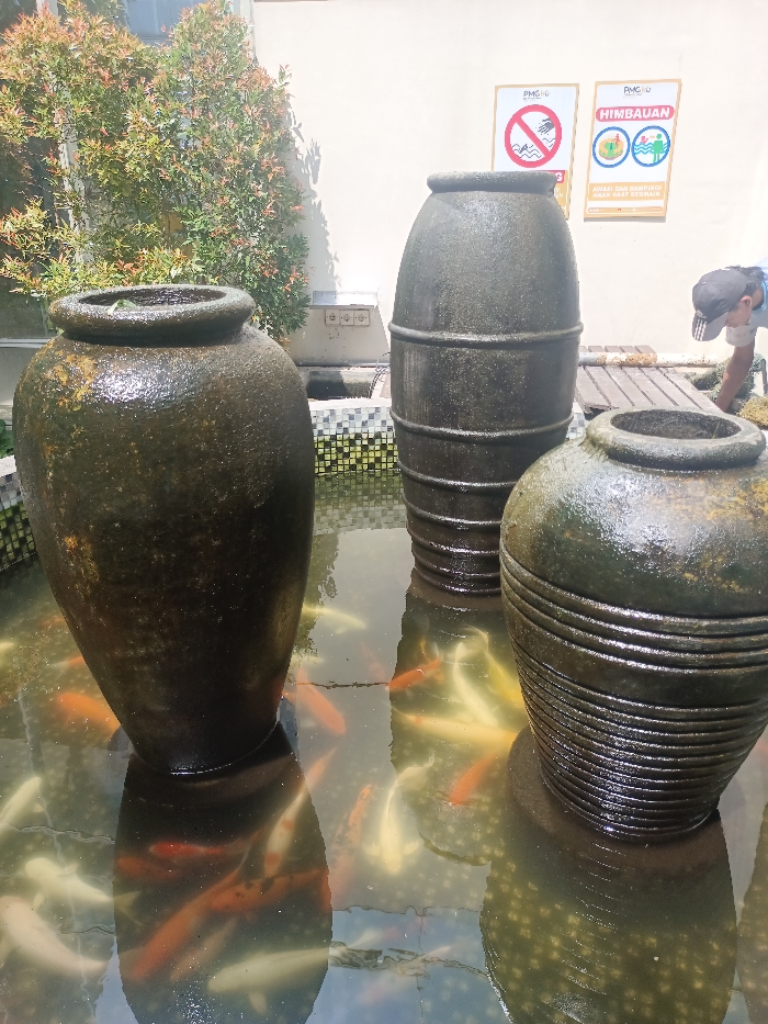 The image captures an outdoor water feature in Kecamatan Pati, Indonesia, during daylight hours. Three large, dark, weathered ceramic or stone jars are partially submerged in a rectangular pond filled with clear water. The leftmost jar is tall and ovoid, the central jar is taller and barrel-shaped with two horizontal bands, and the rightmost jar is shorter, wider, and features multiple horizontal ridges. Numerous orange, white, and yellow ornamental fish (koi) swim within the pond around the jars. The pond's edge is lined with small, dark and light square mosaic tiles. In the background, a light-colored (beige/off-white) building wall is visible. Two rectangular signs are affixed to the upper right section of the wall: the left sign displays a red prohibitory symbol and text including "PMCHRU," while the right sign, titled "HIMBAUAN" in green text, features icons depicting child supervision during play and additional text, also including "PMCHRU." Below the signs and to the left, a gray electrical outlet box with multiple receptacles is mounted on the wall. Lush green foliage with some reddish growth is visible in the upper left corner of the frame, adjacent to the wall. On the far right, partially obscured, an individual wearing a blue long-sleeved shirt and a dark baseball cap is bent over, actively engaged with the area near a low wooden structure and a patch of green moss at the pond's edge.
