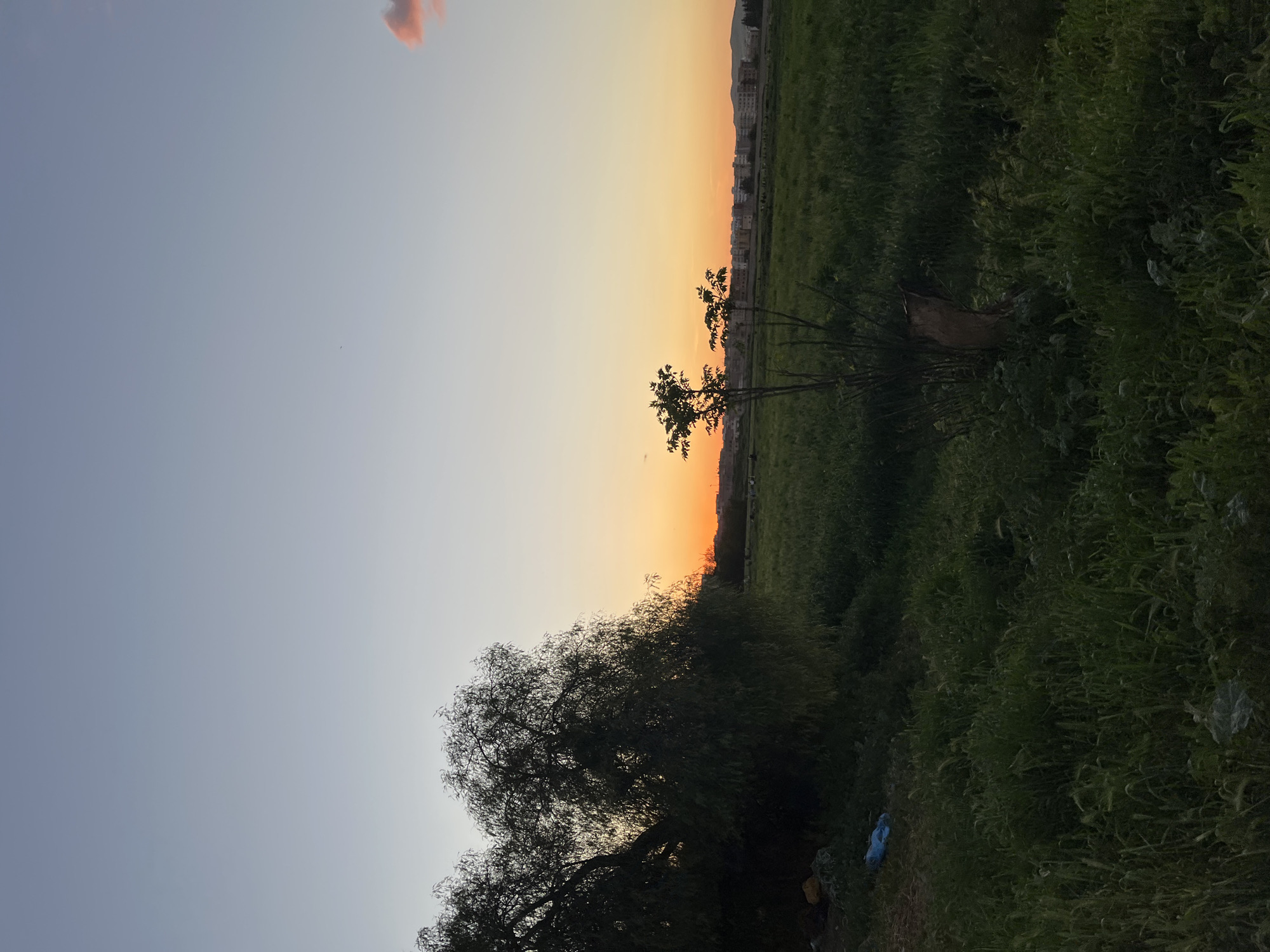 landscape at sunset. The sky transitions from a light blue on the left to orange and yellow hues on the right. In the background, a row of buildings suggests an urban edge, likely the city of Fez, Morocco. In the foreground, there is an area of dense green foliage, possibly a field. A small tree stands prominently in the middle ground. The ground is littered with trash.