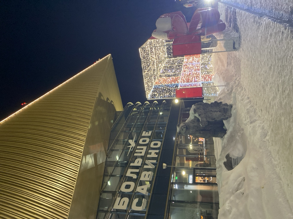 The scene depicts the exterior of a building at night in Bolshoye Savino, Russia, with significant snow accumulation