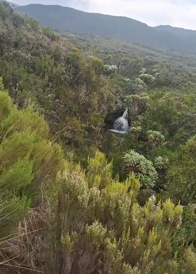 lush, green landscape with a waterfall in the distance. The terrain appears to be mountainous, covered in dense vegetation and some unique, almost succulent-like plants. The sky is overcast, and the scene is still and peaceful. The camera pans slightly to the right, revealing more of the landscape. The general impression is one of natural beauty and tranquility.