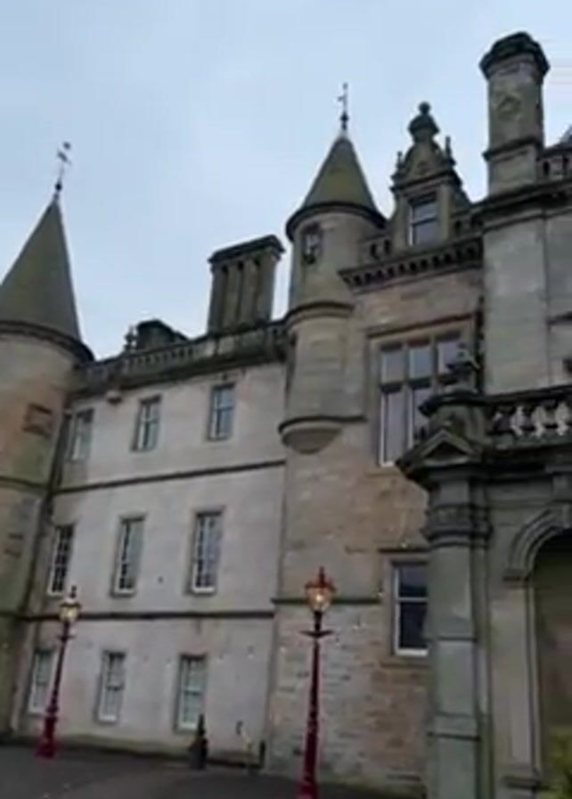 The camera pans upwards and to the right, showcasing the exterior of an old stone building under a cloudy sky. The building has multiple levels, with several windows and two pointed turrets. There are two red lamp posts visible in the foreground. The main entrance features a large arched doorway with detailed stonework. The pavement in front of the building is cobblestone. The overall impression is of an old, possibly historic, structure.