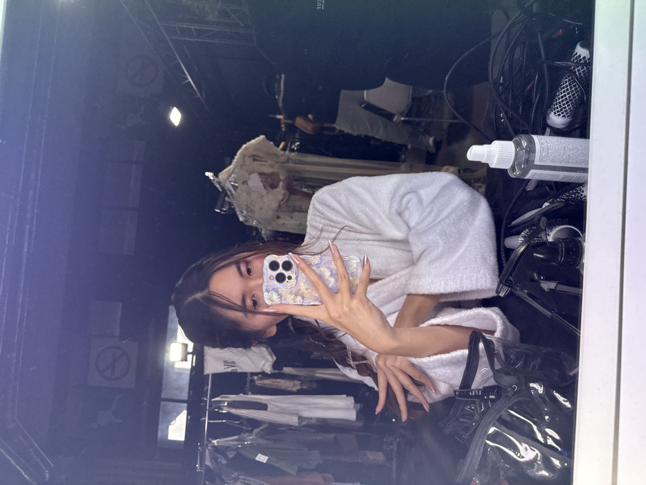 The image depicts a mirror selfie taken indoors within the city of Issy-les-Moulineaux, France. The primary subject is an individual, appearing female, reflected from the waist up, wearing a white terrycloth robe. She holds a light purple, patterned smartphone in her right hand, obscuring the lower half of her face, with her gaze directed towards the phone. Her left hand is raised and extended, with fingers spread, displaying long nails featuring white tips. Her dark hair is styled, exhibiting visible braids or twists. On the surface immediately in front of the mirror, various items are present: a clear plastic zippered bag with black trim, multiple black hair styling brushes and tools, black electrical cords, and a white spray bottle containing a clear liquid with a partially visible label. The background, visible in the mirror's reflection, reveals a dimly lit interior space, likely a dressing room or backstage area. Several metal clothing racks are laden with an assortment of garments, including what appears to be formal or theatrical attire, notably a white, possibly embellished garment on a stand to the right. A piece of white fabric or a banner with partial dark text is visible on a rack in the mid-left. Two circular "No Smoking" signs are affixed to the dark-colored wall or ceiling structure. A bright, rectangular light fixture is also visible on the overhead structure. A second individual, appearing male, is partially reflected in the upper right background, wearing a dark t-shirt and light-colored pants, standing and facing away from the mirror.