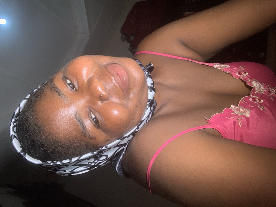 A woman wearing a pink top with flower embroidery is viewed from a low angle. She has dark skin, shiny lips, and a nose piercing. A black and white patterned headscarf covers most of her hair. The lighting is dim, with a bright light source visible in the upper left corner. The background is dark and partially obscured.