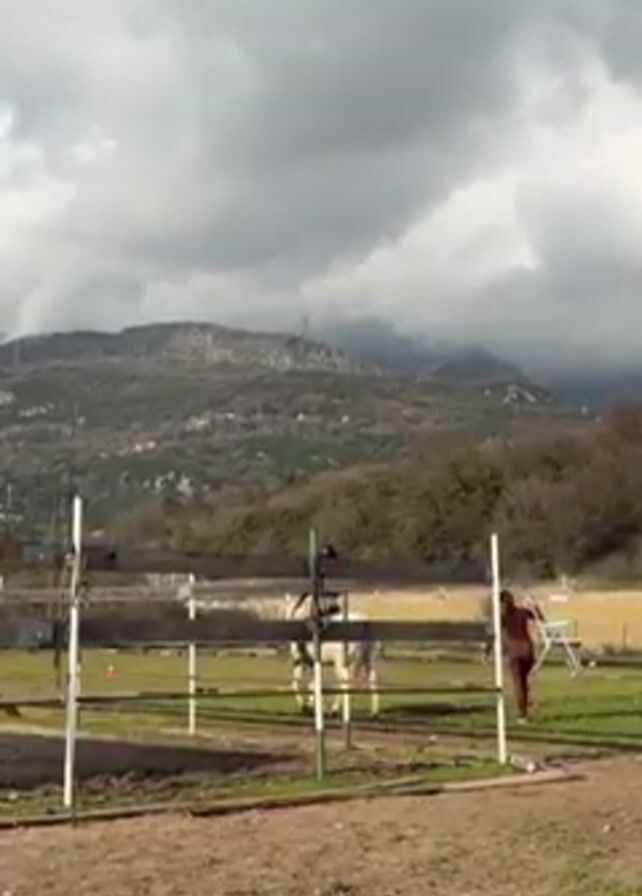 A medium shot shows a woman and a white horse in a fenced training area, with mountains in the background. The woman, with dark hair and wearing a dark-colored outfit, stands near the fence to the right of the frame. The horse, wearing a saddle, is positioned in the center, moving slowly. The training area is marked with wooden rails and vertical poles. The ground is a mix of dirt and grass. Beyond the training area, a hillside climbs into a mountain range. The sky overhead is overcast with heavy clouds that partially obscure the mountain tops. Patches of blue sky appear as the camera tilts upward.