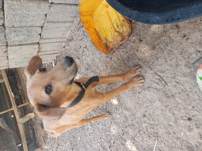 - "The scene, located in Jos, Nigeria, depicts a lean, short-haired dog with light brown fur, wearing a black collar with a silver buckle, standing on a sandy-dirt ground" by FM-xZjgQ2, licensed under CC BY 4.0