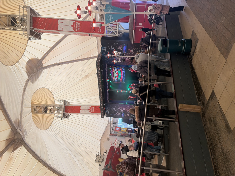 The image depicts the interior of the Skyline Pavilion at Butlin's Skegness resort in East Lindsey, United Kingdom. The scene is dominated by a large, light-colored tensile fabric roof structure supported by internal metal framework and two prominent central pillars adorned with red banners displaying "90 YEARS OF ENTERTAINING THE NATION" and "Butlin's" branding. At the center-back, a raised stage features an active performance with multiple individuals dressed in red costumes engaged in a choreographed routine. The stage backdrop is illuminated with colorful, geometric patterns and musical note graphics. A diverse crowd of approximately 20-30 individuals, including adults and children dressed in casual winter attire, are gathered in front of the stage, observing the performance. They occupy a multi-tiered viewing area, separated from the foreground by a metal and glass railing system. To the left, decorative elements include a large red airplane model mounted on a wall. To the right, several street-style lampposts with multiple red-orange lamps are visible, alongside a red kiosk-like structure. The foreground features a tiled floor in light and dark squares, and a dark green litter bin with "BUTLIN'S" branding is positioned near the railing on the right. The overall environment is brightly lit, primarily by artificial lighting.
