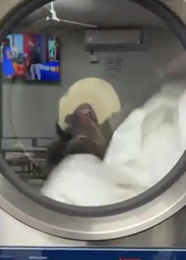 large commercial dryer in operation. White and black clothing are being tumbled inside the stainless steel drum. A person is taking a video of themselves reflected in the dryer door.