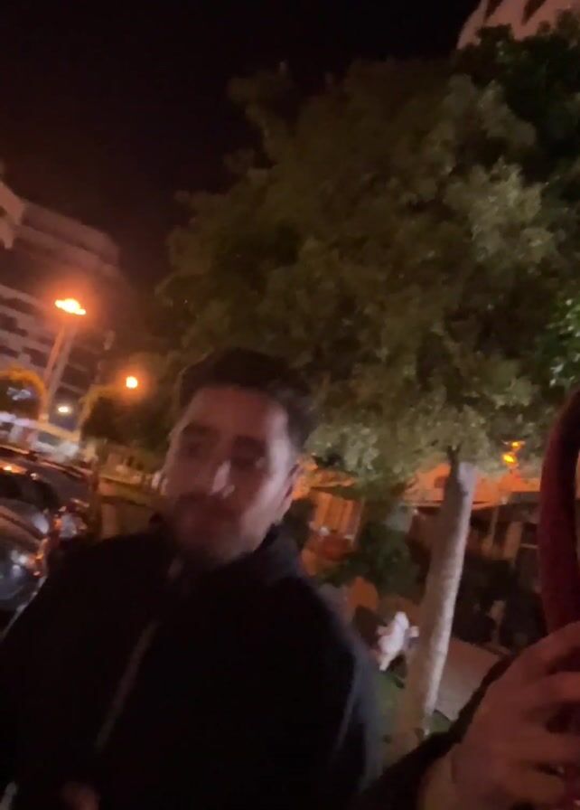 Two men are walking on a street at night. One man, wearing a red hoodie, is smoking a cigarette. The other man, wearing a black jacket, shouts "Vanco!" Trees line the street and a multi-story building is visible in the background. Streetlights illuminate the scene.