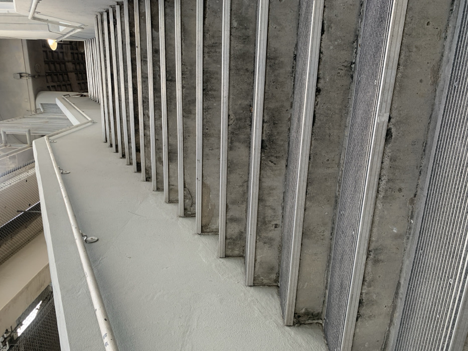 The image displays a concrete staircase ascending between two light grey walls, characteristic of urban infrastructure in Miami, United States of America