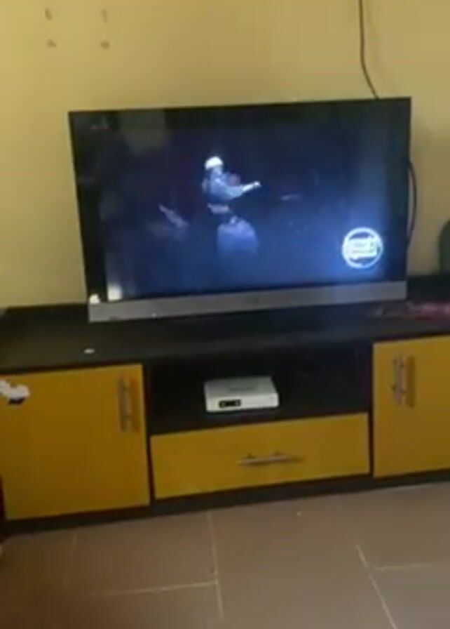 A low-angle shot shows a TV playing on a brown and yellow TV stand