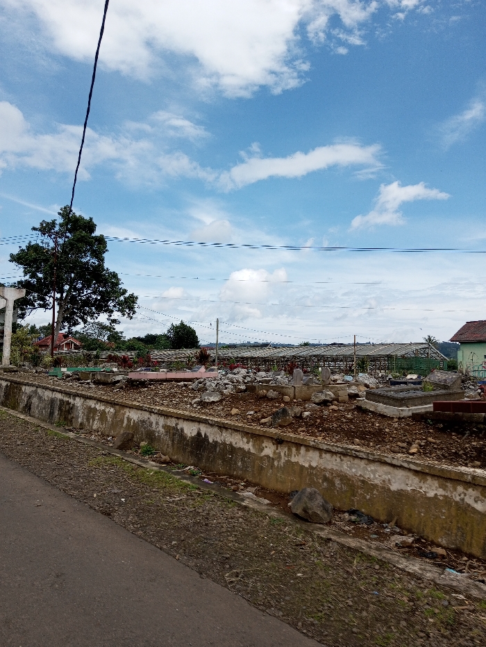 The image captures an outdoor scene in Ariyalai, Sri Lanka, under a partly cloudy blue sky. In the foreground on the left, a section of asphalt road is visible, bordered by a dirt and gravel verge that transitions to a weathered concrete drainage wall. This wall, approximately 0.5 meters high and discolored with dark stains and peeling finish, extends horizontally across the mid-ground. Beyond the concrete wall lies a visible portion of a cemetery or burial ground, characterized by disturbed brown earth, scattered rocks, and sparse vegetation. Numerous grave sites are present, marked by various forms including concrete slabs, mounds of rocks and earth, and several distinct, unadorned headstones. Some grave perimeters are outlined with light pink or off-white paint. In the background on the left, a large, mature tree with dark green foliage stands prominently, partially obscuring a white structural element and a building with a red-tiled roof. To the center-right, a large agricultural structure with multiple parallel metal arch frames, likely a greenhouse or shade net, extends horizontally across the landscape. On the far right, part of a light green building with a reddish-brown roof is visible. The upper portion of the scene is dominated by a bright blue sky with scattered white cumulus clouds. Multiple dark utility lines traverse the frame, running diagonally from the upper left and horizontally across the upper mid-section. No individuals or animals are present in the depicted scene.