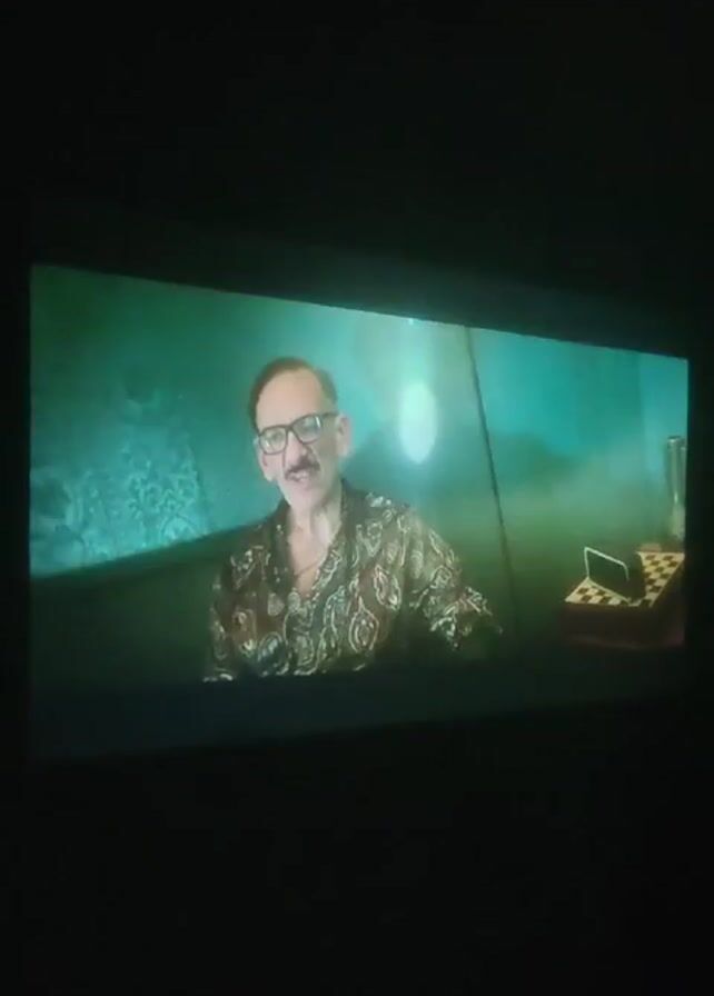 A movie scene is displayed on a screen in a dark room. An older man with glasses and a patterned shirt sits on a couch, facing towards the right of the screen. In the background, a man stands in a doorway, facing the foreground. There's a fireplace with a portrait above it in the center of the scene. The room has blue-green walls and a shelf unit on the left. The man on the couch is talking.