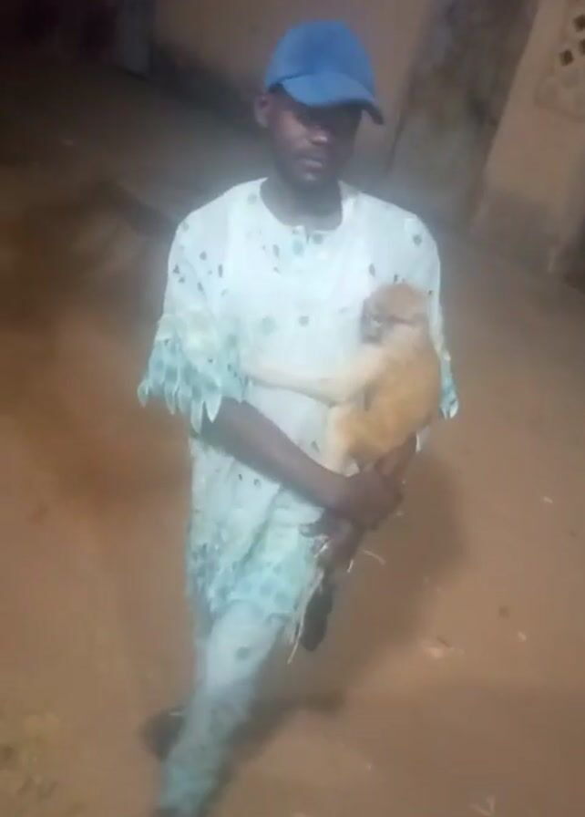 The video depicts a man holding a monkey in his arms. He is wearing a blue baseball cap, a light-colored patterned shirt, and matching pants. The monkey is light brown. The setting appears to be outdoors, with a reddish-brown ground and a building visible in the background. The lighting is dim. The man is standing still, looking at the camera, while holding the monkey. The video is somewhat blurry, and there is a logo for "TECNOCAMON 17" at the bottom left corner of the frame.