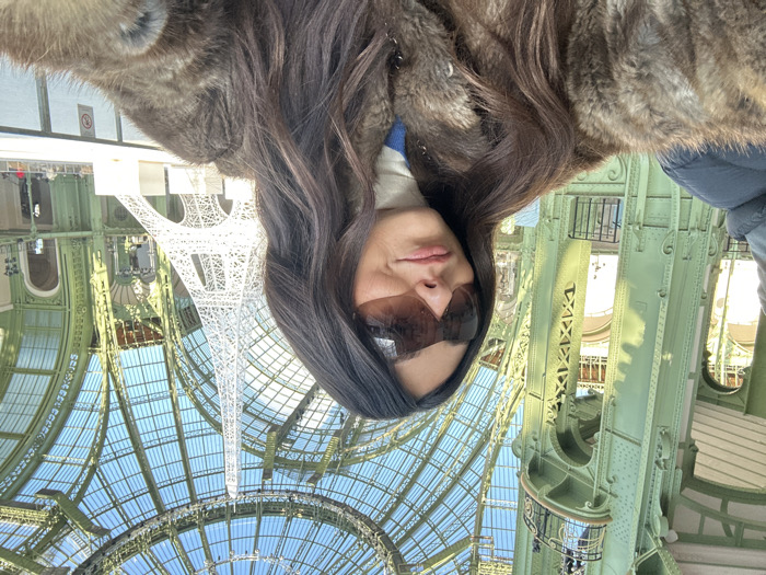 A female individual is positioned in a selfie, captured from the chest up, within the Grand Palais des Champs-Élysées in Paris, France