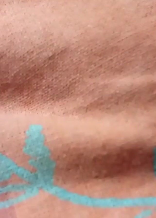 A close-up shot shows a piece of fabric. The fabric is light pink with a turquoise floral pattern. The texture of the fabric appears slightly worn and fuzzy. The light illuminates the fabric, creating shadows and highlights on its surface. The shot remains still, capturing the details of the fabric's texture and design. A brief snippet of speech is heard in the audio.