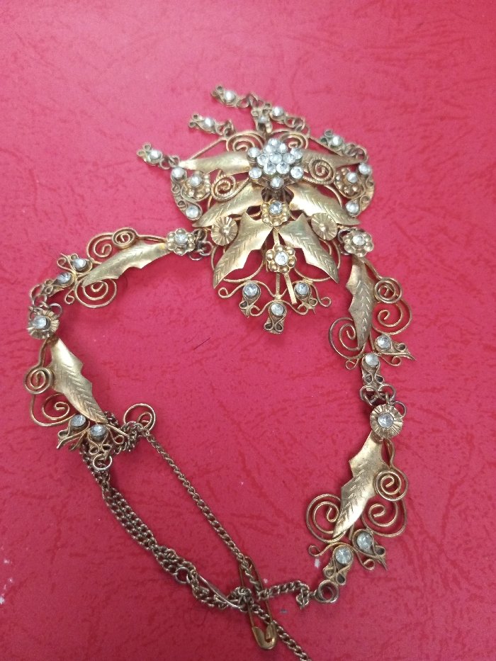 An ornate gold-toned metal necklace sits on a red surface. The necklace features intricate designs of leaves, swirls, and small white gems. A large floral centerpiece is at the top, with matching details extending down on either side. A chain with a safety pin attached dangles from one end of the necklace. The overall impression is of vintage or antique jewelry.