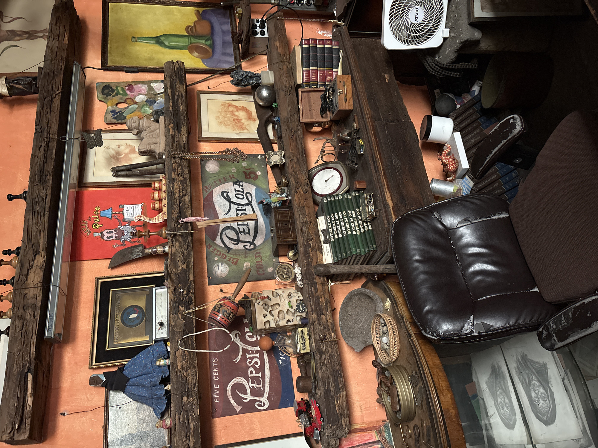 This detailed description outlines an interior space within the city of Cuernavaca, Mexico, characterized by an eclectic and densely arranged collection of objects displayed on multiple wooden shelves against an orange-painted wall. The scene features three prominent, rough-hewn wooden shelves spanning the length of the orange wall. A fluorescent light fixture is mounted beneath the uppermost shelf. On the **topmost shelf**, from left to right: a small, dark doll figure dressed in a blue skirt and black top; a framed gold plaque with a circular emblem, bearing the text "ASOCIACION NACIONAL DE DEPORTES"; a small, circular clock; a large, curved metal blade or machete; several small decorative items, including what appear to be chess pieces further left (mostly out of frame). Directly above the main line of sight, various framed artworks are visible: a profile portrait of a woman, an artist's palette displaying multiple paint colors, and a framed painting depicting a green bottle and brown pottery on a purple cloth against a yellow background. A red poster featuring cartoon figures, possibly advertising "BAZAR LA PULGA," is visible on the right side of this shelf. The **middle shelf**, located below, displays a diverse assortment of vintage items. From left to right: a partially visible "FIVE CENTS PEPSI-COLA" advertisement sign; a necklace with white beads hanging over the shelf edge; a red toy truck and a red toy car; a small model sailboat; various bottles and containers; a white, rectangular object embedded with numerous small stones or fragments; a framed drawing of a cherubic child's head; a dark, sculpted gargoyle-like figure; a silver spherical object; and a small electronic device with multiple ports, possibly a power strip, with various wires connected. Another vintage "BETTER COLD PEPSI" sign is partially visible on the right. The **bottom shelf**, which also functions as a desk surface, holds further collections. On its left side, an oval wooden table surface is visible, bearing metallic rings, a small woven basket filled with pebbles or shells, and other small items. A dark brown leather armchair, showing significant wear, tears, and discoloration on its armrests and back, occupies the lower central and right foreground. Its seat is upholstered in a contrasting brown fabric. Behind the armchair and on the desk surface, stacks of books are visible; some have green spines with text in Spanish, and others have dark red spines. An old analog clock, various tools, and small wooden boxes are also present. To the far right, a white ATIVIO brand fan is positioned on a light-colored, possibly concrete, block or pedestal. Underneath the main desk, visible through a glass panel, are two large charcoal drawings of stylized faces, emphasizing the eyes. No people are present in the image. The environment suggests a personal study, workshop, or an antique/curiosity shop, characterized by its dense arrangement of objects, artworks, and memorabilia, reflecting a keen interest in collecting and display.