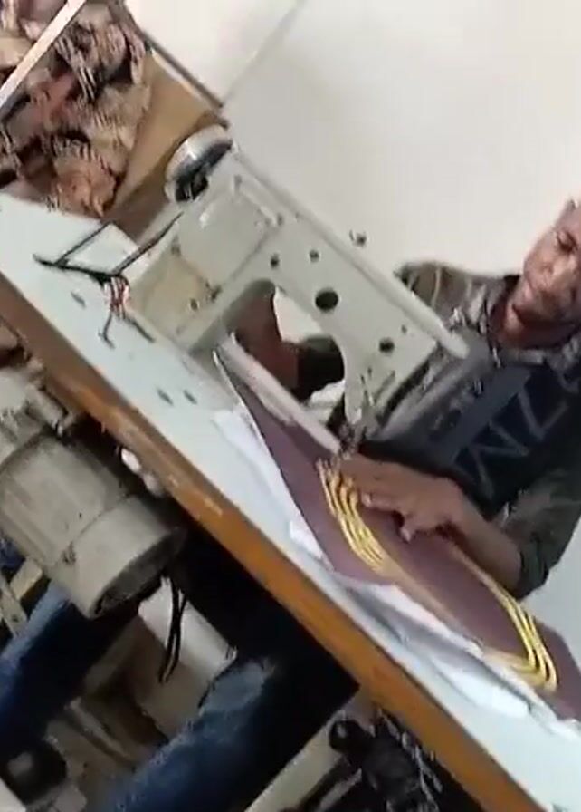 A bald man is operating a sewing machine, working on a brown fabric with a gold design. He is wearing a patterned shirt and jeans. Another man is seated in the background, wearing a patterned shirt and dark pants. The sewing machine is on a white table with a motor underneath. The room is brightly lit with white walls, and electrical outlets are visible. The scene appears to be a tailoring workshop.