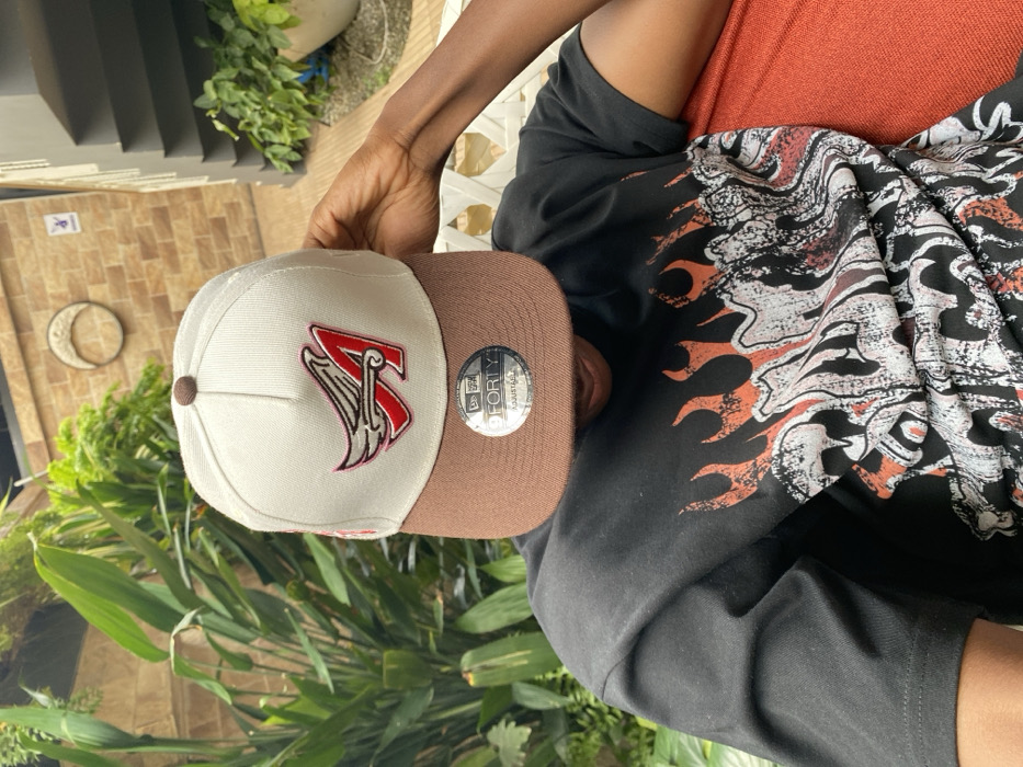 A single individual is seated in an outdoor or semi-outdoor setting in Moba, Nigeria. The person's face is entirely obscured by a light beige and brown baseball cap, displaying a red "A" logo with gray wings. A "New Era 9FORTY ADJUSTABLE" sticker is present on the cap's brown brim. The individual is wearing a black short-sleeved t-shirt with a graphic design of orange and white flame-like patterns and distorted white text or imagery across the chest. Their right arm is bent, with the hand positioned near the back of the cap. The individual rests on a reddish-orange cushioned surface. The background comprises dense green foliage on the left, a light brown brick wall with a circular decorative object mounted in the center, and a grey structural element with stairs and a white potted plant to the right. The scene is illuminated by natural light.