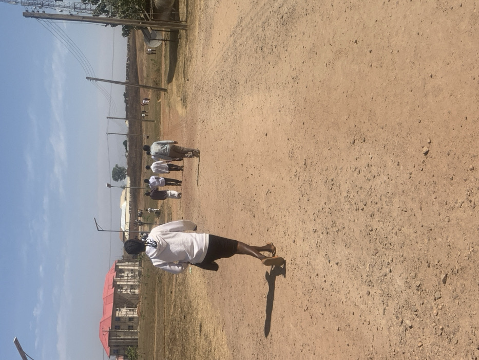 A group of individuals in white shirts and dark bottoms are observed on a dirt road
