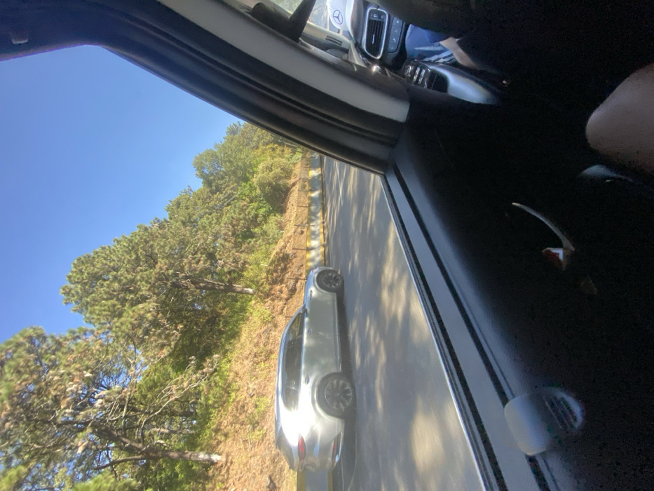 Captured from inside a car, a silver vehicle drives on an asphalt road. Trees line the road's edge with a clear blue sky above. The car's interior details, including the dashboard and door panel, are visible in the foreground, framing the roadside scenery.