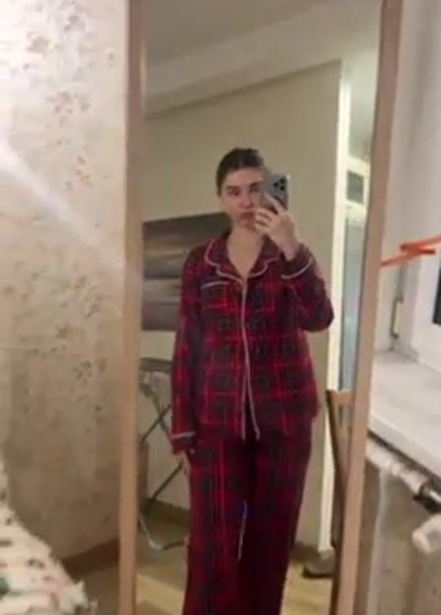 young woman in red plaid pajamas, standing in front of a mirror taking a selfie