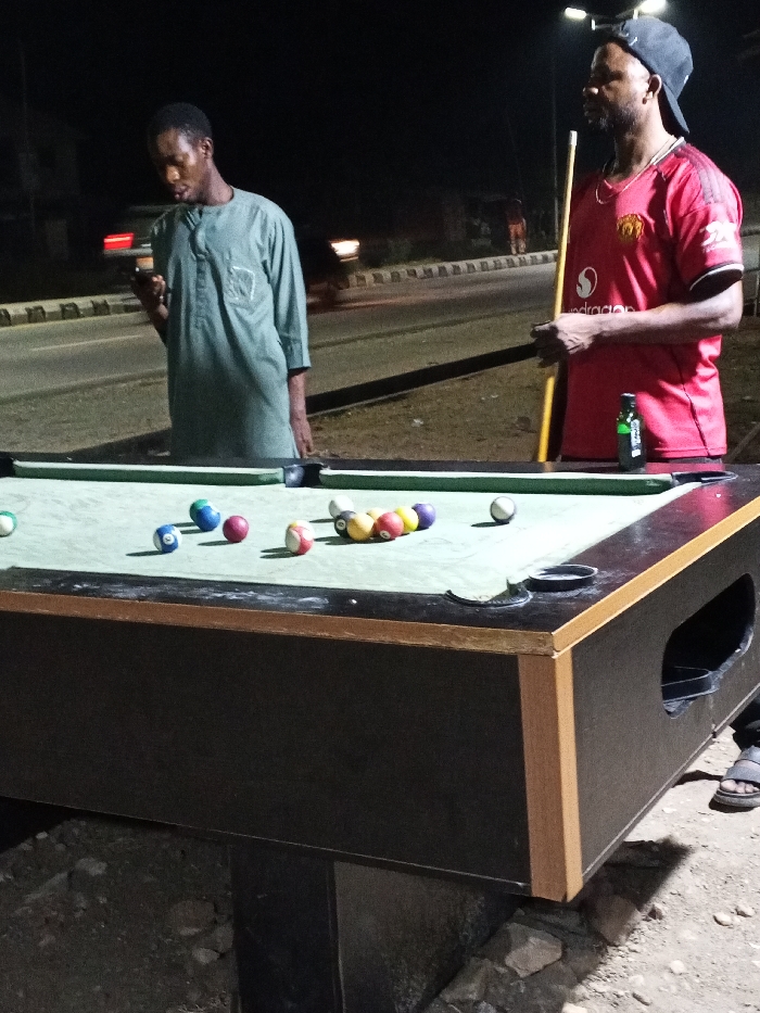Two men play pool at night. One man in a green shirt looks at his phone, while the other, in a red soccer jersey and baseball cap, holds a pool cue. A set of pool balls is on the green felt of the table. A road and buildings are visible in the background. A bottle sits on the edge of the pool table next to the man in the red jersey.