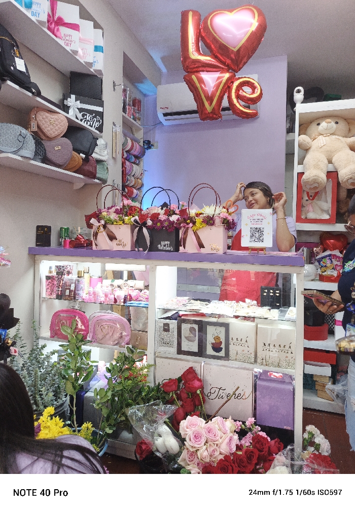 Inside a store, shelves display heart-shaped purses and gift boxes on the left. A woman stands behind a counter with floral arrangements, holding a small sign with a QR code. A "LOVE" balloon floats above. The shelves beneath the counter are filled with items like perfume and gifts, and a variety of roses sit in the foreground. To the right, a stuffed teddy bear is positioned near a woman holding a phone.