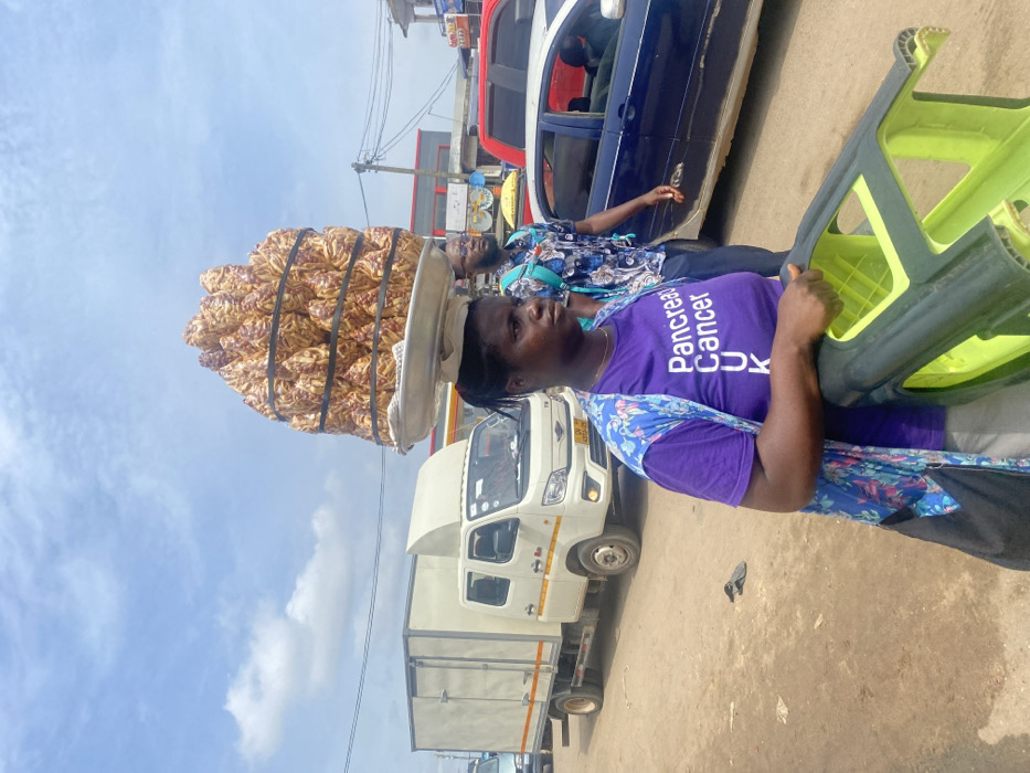 An African woman is depicted mid-stride on a dirt road in Ablekuma, Ghana, under a partly cloudy sky. She wears a purple t-shirt with "Pancreas Cancer C U K" printed in white, an open floral-patterned shirt, and a black shoulder bag. On her head, she balances a large, conical stack of individually wrapped light brown items, secured by horizontal bands, resting on a silver-colored tray. In her hands, she holds a disassembled green and black plastic chair frame. To her left, a pair of black flip-flops lies on the ground. Behind her, an African man with a short beard and dark-rimmed glasses walks, wearing a patterned shirt and a light blue backpack. In the background, a white Foton T3 box truck (license plate GV 1954-21) is visible, alongside a dark blue sedan with minor side damage, and parts of a red vehicle. Utility poles and wires are present in the distant background, indicating a populated area with commercial activity.