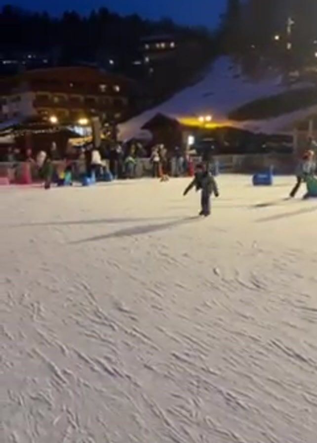 n outdoor ice rink at dusk, surrounded by people. Some people are ice skating, and others are watching from the sidelines. The rink is surrounded by barriers and the ground is covered in snow. There are buildings and trees visible in the background. The sky is a deep blue. One child falls while skating near the edge of the rink.