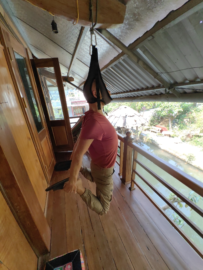 In Mù Cang Chải, Vietnam, a male individual is observed suspended horizontally by his head on a wooden balcony. He wears a red short-sleeved t-shirt and tan cargo pants, is barefoot, and holds two black flat objects near his bent knees. A black fabric cervical traction device, comprising a head harness, carabiners, and metal chain links, is connected to a rope that is secured to an overhead wooden beam. The balcony features polished wooden plank flooring and a wooden railing along its right edge. The ceiling above consists of exposed wooden beams and corrugated metal sheeting. To the left, wooden paneled walls and a door with glass inserts are visible. Beyond the railing, a narrow canal flows with green water, bordered by lush green vegetation. A small thatched-roof structure and two red bench-like objects are discernible on the far bank under bright natural light.