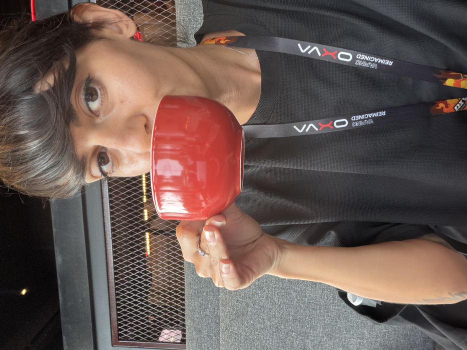 An adult female is depicted from the mid-torso up, seated indoors in Jimbaran, Indonesia. She has dark hair with bangs, brown eyes with winged eyeliner, and is wearing red stud earrings. A dark, textured short-sleeved top covers her torso. Around her neck, a black lanyard is visible, displaying "OXVA Vaping REIMAGINED" in white and red text, along with a flame graphic. Her left hand, adorned with a silver-colored ring featuring a light-colored stone on the ring finger, holds a solid red ceramic mug to her lips, partially obscuring her mouth and nose as she drinks from it. She looks directly forward. The immediate background behind her consists of a gray, textured upholstered surface. Further back, a dark metal grate or mesh partition is visible, through which faint light reflections appear.