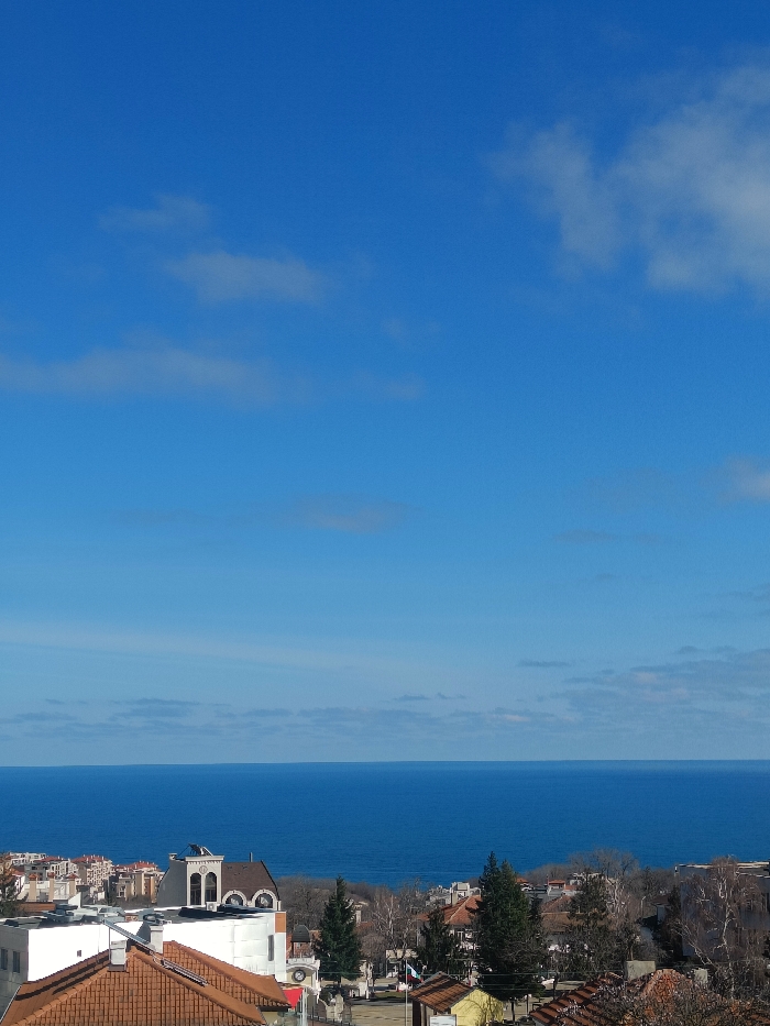 The image depicts an elevated view of the city of Byala, Bulgaria, overlooking the Black Sea under a clear blue sky. The upper two-thirds of the frame are dominated by a deep blue sky with sparse, scattered white cumulus clouds. Below the horizon, a calm expanse of the Black Sea stretches across the mid-ground. The foreground and lower mid-ground reveal a dense cluster of residential and commercial buildings within Byala. Prominent features include various tiled and flat rooftops, a multi-story white building with an arched brown-tiled roof section, multiple arched windows, and a visible solar panel on its upper flat roof. Numerous evergreen trees and bare deciduous trees are interspersed among the structures. A flagpole displaying the Bulgarian flag (white, green, red stripes) is visible among the buildings in the mid-right. No individuals are present in the scene, and no overt actions or interactions are occurring. The environment suggests a clear day, possibly during a colder season given the lack of foliage on some trees.
