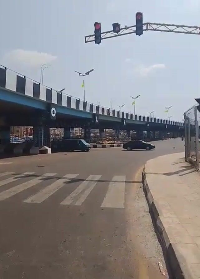 Here is a detailed description of the video: The video shows a street scene featuring an elevated highway overpass in an urban setting. The highway is painted with blue girders and has black and white striped barriers along the sides. Large white letters spelling out "MOLE" are attached to the highway structure. Below the overpass, there is a street with a crosswalk and an adjacent sidewalk. The traffic lights above the crosswalk are red. Some cars are visible driving on the roads around the overpass. There are streetlights lining the top of the overpass. The sky is light blue with some scattered clouds. The overall environment suggests a bustling, though somewhat quiet at the moment, urban area. The weather appears clear and bright. There are some people visible in the background, near what appears to be a market area under the overpass.