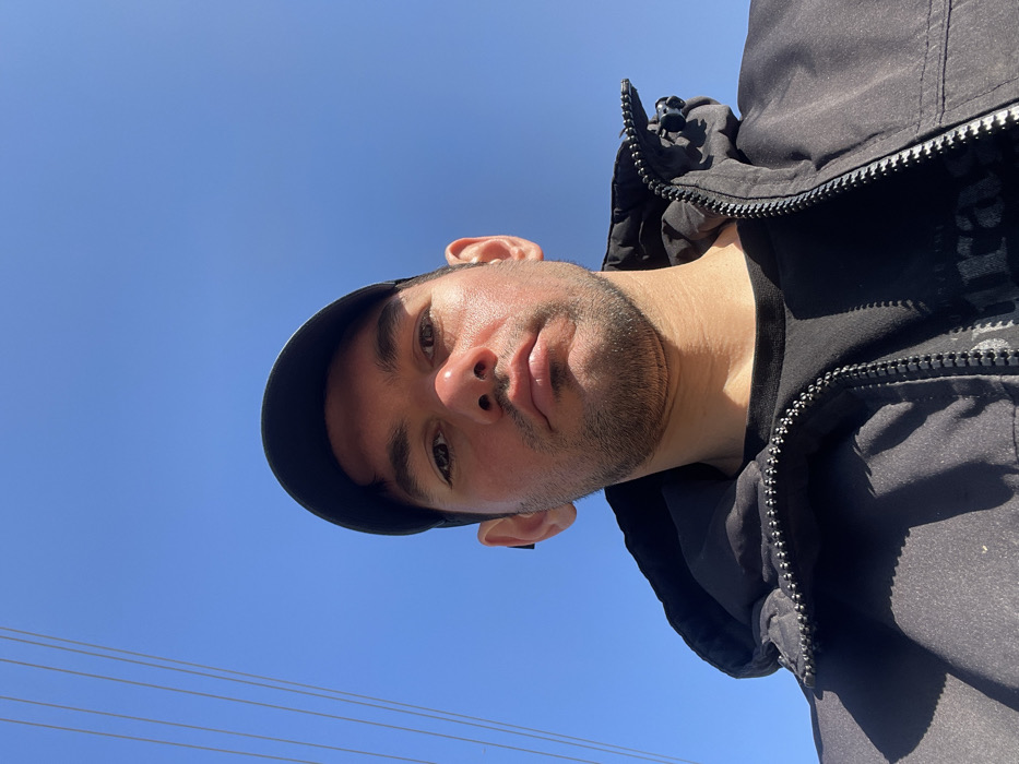 The image displays a male individual in a low-angle perspective, captured in a selfie format, against a clear blue sky