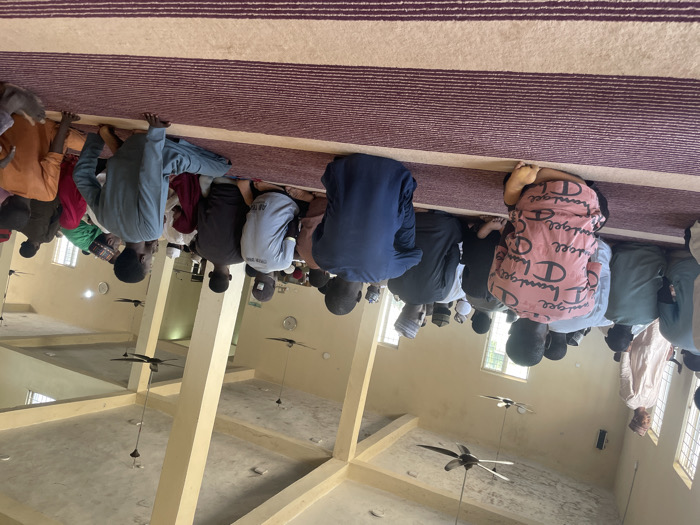An interior wide-angle photograph depicts approximately 30-50 adult males gathered for prayer in a mosque located in Panshekara, Nigeria