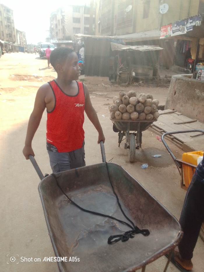 A young boy in a red tank top and gray shorts pulls an empty wheelbarrow on a sunny, dusty street. Another wheelbarrow, loaded with round, light brown objects resembling yams or potatoes, stands nearby. Shops and buildings line the street. The scene suggests a marketplace or residential neighborhood, possibly in a developing country. The "Shot on AWESOME A05s" watermark is visible in the bottom left corner.