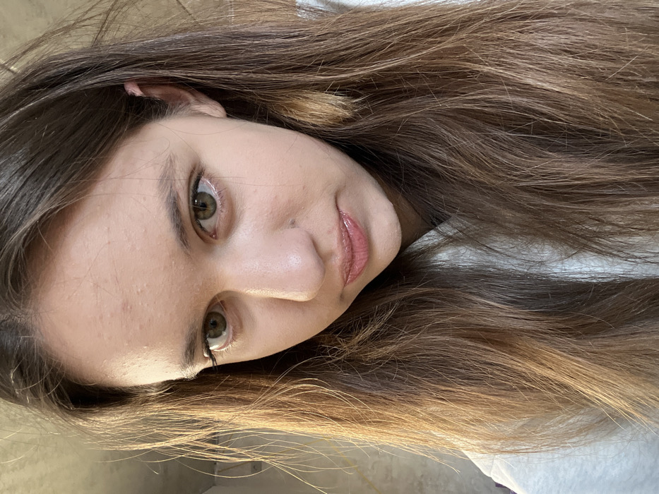 A close-up portrait features a young female subject positioned centrally, looking directly at the viewer. She has long, straight, brown hair that extends beyond the lower frame, partially covering her shoulders. Her eyes are greenish-brown, and her lips are slightly parted, revealing a pink, glossy appearance. The subject's skin is fair, with minor texture visible on the forehead and a small dark mark on the right cheek. She is wearing a light-colored hooded garment. The background is out of focus, indicating an indoor environment with muted, light grey or beige tones, possibly an unfinished wall or concrete surface. A dark linear element is discernible in the upper left portion of the background. The scene is located in Семибратово, Russia.
