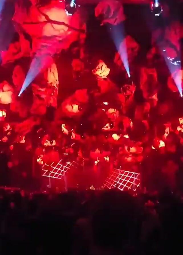 live concert or event. A large crowd is visible in silhouette in the foreground, facing a stage that is dimly lit. Overhead, there is an elaborate installation composed of many irregularly shaped elements, appearing as abstract forms, possibly made from fabric or another lightweight material. These elements are lit with vibrant red light, then white light, creating a dynamic visual effect. The white lights shine down in beams, illuminating the stage and the crowd. The lighting changes from intense red to bright white beams, adding to the energy of the event. The overall environment suggests a large, indoor venue, possibly a concert hall or event space. The focus is on the light show and the atmosphere of the event rather than specific individuals or actions.