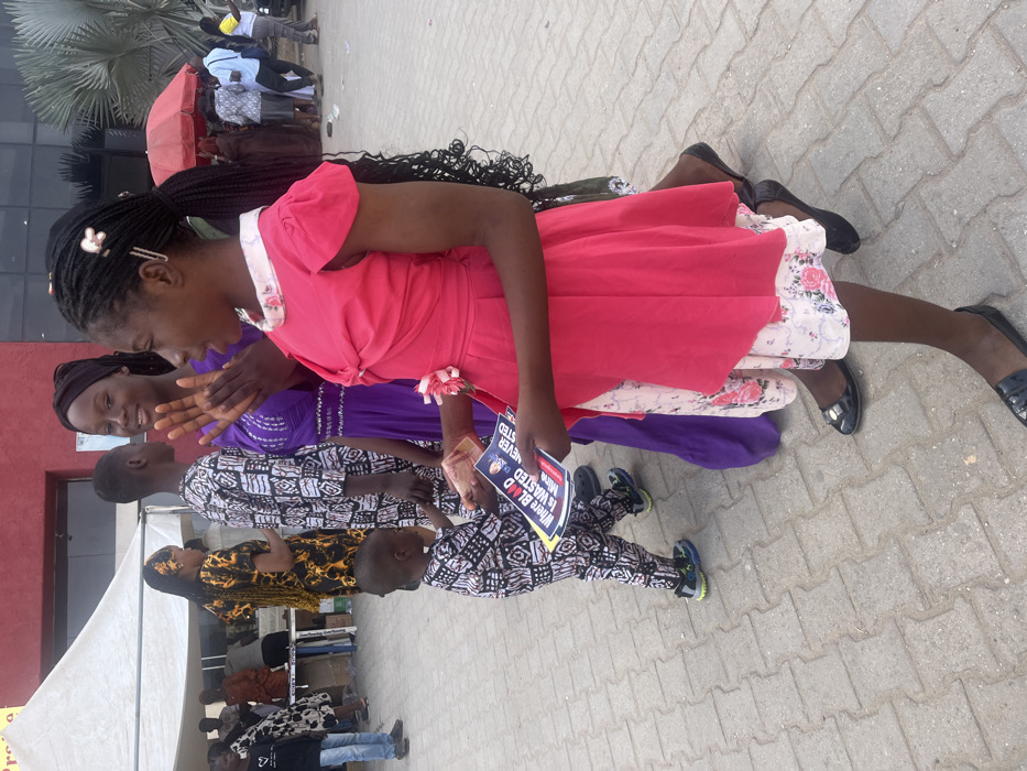 An outdoor scene in Iddo Tudunwada, Nigeria, depicts a public gathering on a paved surface. In the foreground, a young female, approximately 8-12 years old, with dark skin and long black braided hair in a ponytail, is seen in profile facing left. She wears a bright pink short-sleeved dress with a white collar and a floral underlayer, holding multiple brochures or flyers that partially display text "WHERE BLOOD IS WASTED" and an image of a male face. To her left, an infant or toddler, also with dark skin, wears a black and white patterned two-piece outfit and green and black athletic shoes, reaching out towards the female. Behind the toddler, an adult female with dark skin, wearing a purple dress and a black headscarf, smiles and has her hands raised, appearing to interact with the girl. A male youth in a black and white patterned shirt stands further back. The ground is paved with interlocking grey concrete pavers. In the midground, a white canopy tent is erected, with multiple individuals congregating around tables. A reddish-brown building facade is visible on the left, and a large red market umbrella stands on the right, under which more people are gathered. The scene is brightly lit by daylight.