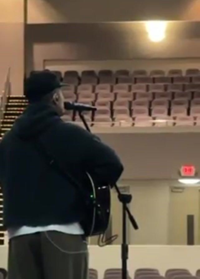 male figure playing a guitar and singing into a microphone. He is seen from the back, standing on a stage in a large, empty auditorium. The auditorium is filled with rows of empty seats. The man is wearing a dark-colored hoodie, light-colored pants, and a baseball cap. A single light is visible in the ceiling, and an exit sign can be seen on the right side of the frame.