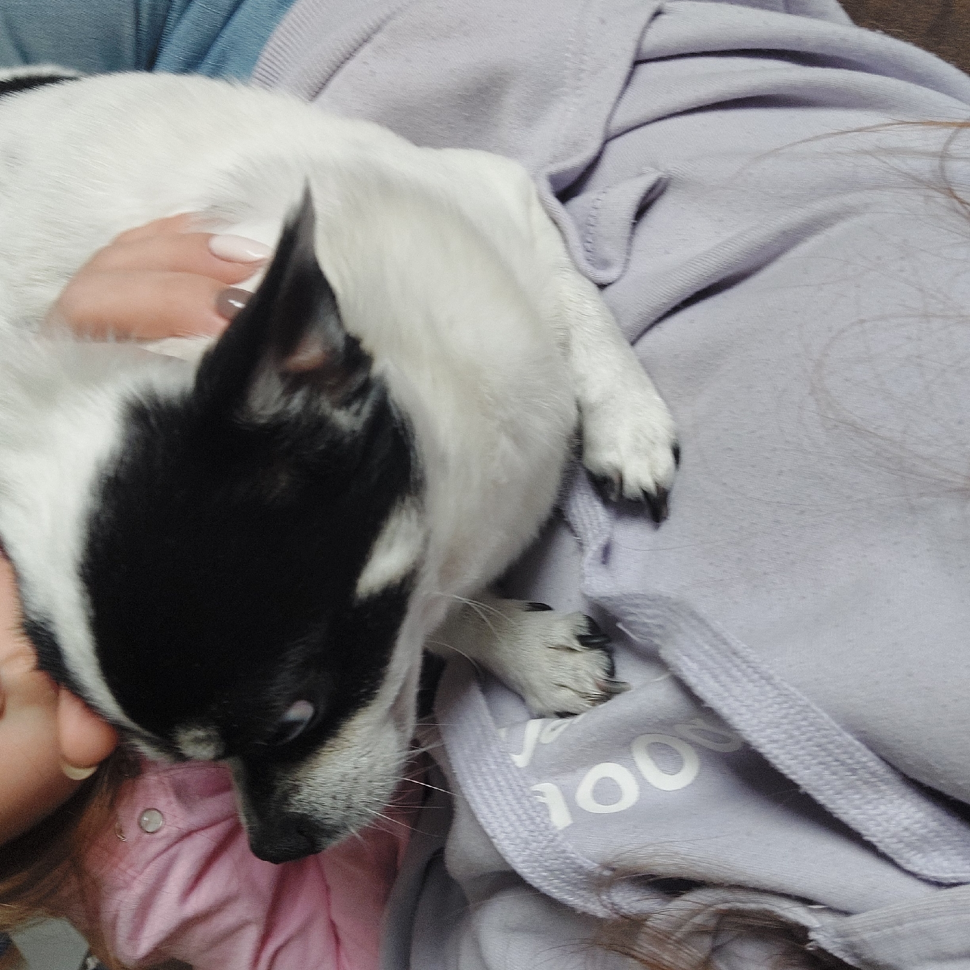 A black and white Chihuahua rests on a person wearing a lavender-colored hooded sweatshirt. A hand is visible, gently holding the dog. The person is wearing a pink garment under the sweatshirt and is resting in Haskovo, Bulgaria.