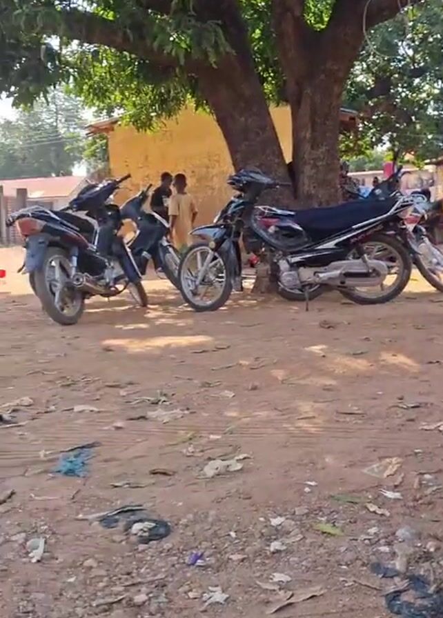 dirt area under a large tree with several motorcycles parked. In the background, there's a low building with a wall around it. People are visible, some standing and some sitting. A white car is parked on the right side of the frame, partially obscuring the view. The ground is covered with leaves and some debris. The overall setting appears to be a rural or semi-rural environment.