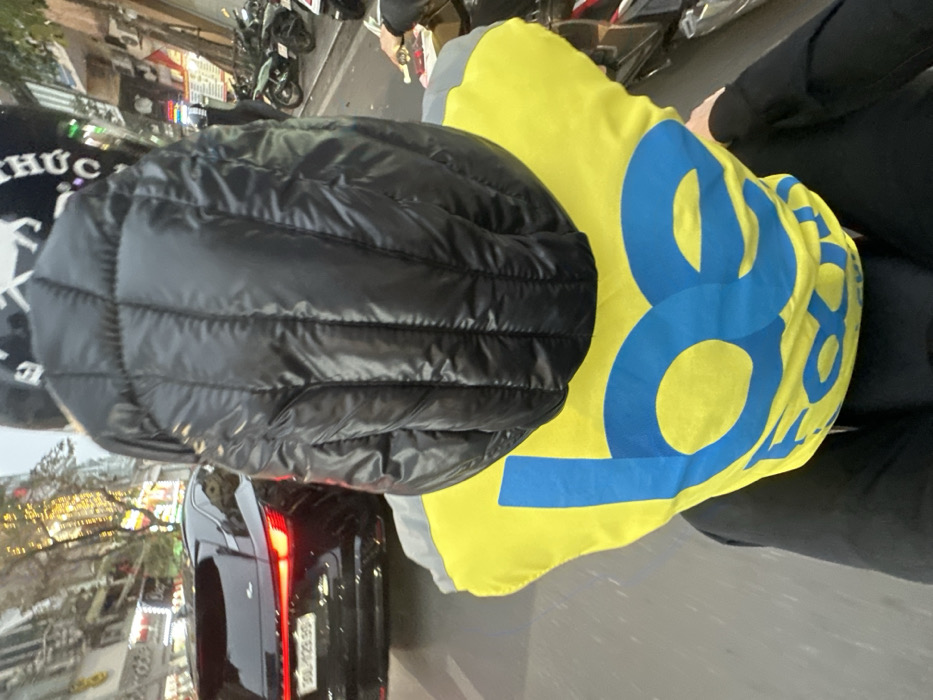 The image depicts an urban street scene in Hà Nội, Vietnam, captured from a rear-facing perspective on a moving motorcycle. In the immediate foreground, the back of a person is visible, wearing a black hooded puffer jacket over a bright yellow sleeveless vest that prominently displays a large blue "be" logo, identifying them as a "be" ride-hailing or delivery service operator. Their lower body is clad in dark-colored pants. Ahead on the street, a black SUV with illuminated red taillights is visible, bearing a Vietnamese license plate with the registration "30U-129.99", which confirms the Hà Nội district. To the right of the SUV, several motorcycles are parked along the curb. The background features commercial buildings with various storefronts, overhead utility wires, and string lights with small bulbs, indicating dusk or evening ambient conditions. The scene suggests active street traffic.
