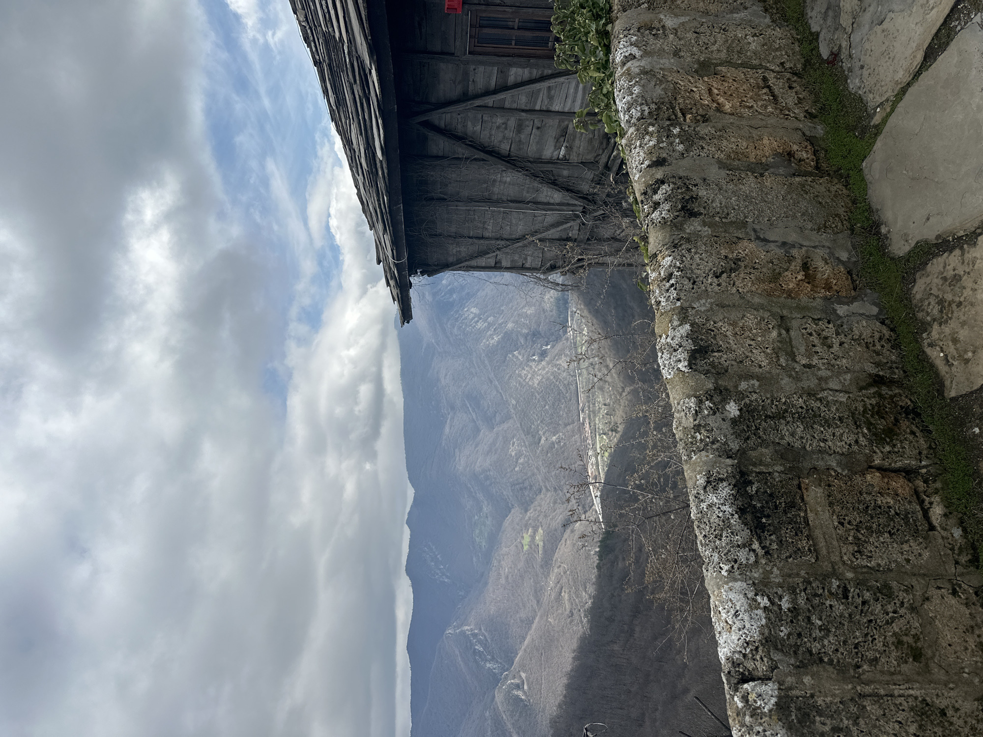 The image is an upward-angled, outdoor view, likely taken from a high vantage point near Glozhene, Bulgaria. The scene consists of a building with a wooden roof and siding adjacent to a stone wall, with a mountainous landscape and cloudy sky in the background. Building Details: * The building is constructed of dark, weathered wood. * The roof is made of overlapping wooden shingles. * A small window is visible near the roof. Stone Wall Details: * The wall is built from irregular-shaped stones. * Moss and lichen are growing on the stone surfaces. Landscape Details: * A valley with dense, forested mountains. * A road winds through the valley. Sky Details: * The sky is filled with a mix of white and gray clouds.