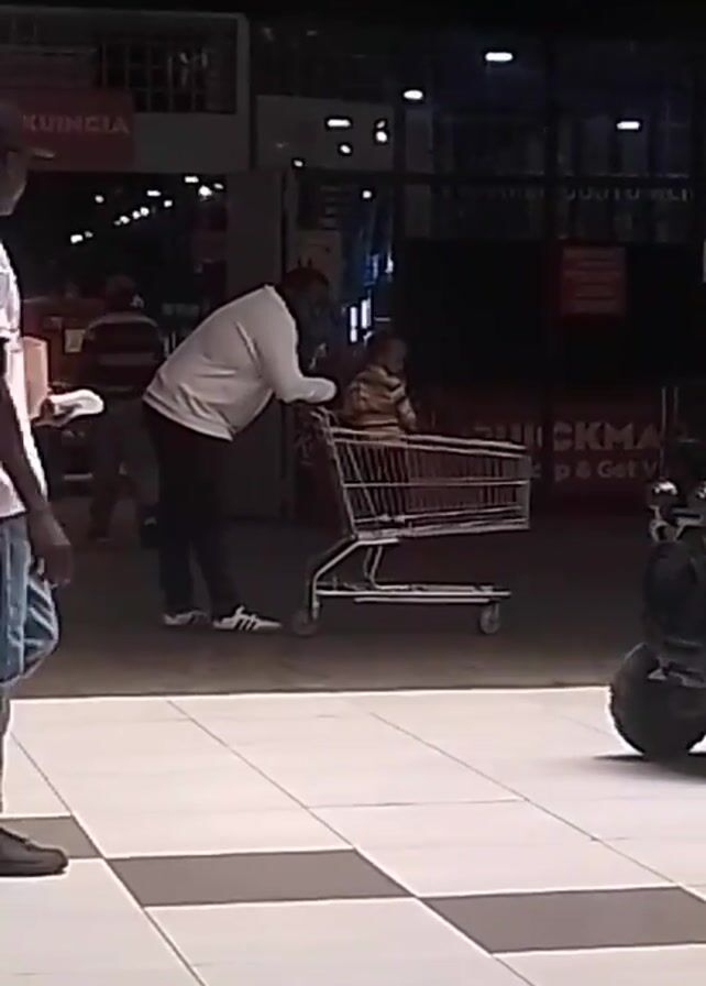 n indoor scene, likely a shopping mall or large store, with a tiled floor in a black and white checkerboard pattern. In the foreground, a young child is seated in a black and white electric toy jeep. A man in a white soccer jersey, blue jeans, and black boots is walking towards the toy car, seemingly interacting with the child. In the background, another man is leaning over a shopping cart where a child is sitting. There are other people visible in the background, as well as a sign that reads "TRY/ KUINCIA". The lighting is bright but slightly dim, typical of indoor shopping areas.